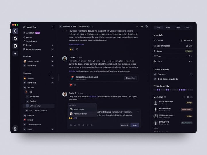 - User Analytics: Analytics dashboard to monitor the engagement and productivity metrics of team members.