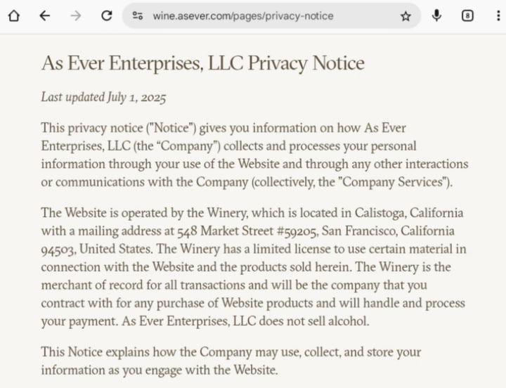 It is noted that As Ever Wine referred to as the "Winery" on the website seems to be a separate legal entity which owns the alcohol license. It also has a separate mailing address in San Francisco, California.