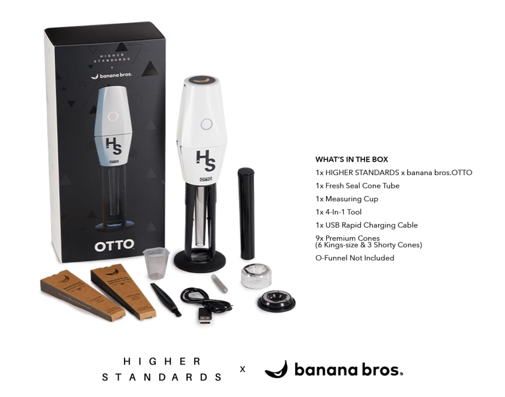The OTTO™ by banana bros.™ is the world's first automatic smart rolling machine that can finely grind your dry herbs and roll a cone in seconds. This sleekly designed all-in-one device is able to grind and pack 20-30 cones per charge, automatically and evenly filling premium cones with efficiency. The OTTO grinder transforms dry material to cone in mere seconds, delivering perfect rolls every time. Employing their own innovative SMART grinding technology™, banana bros.