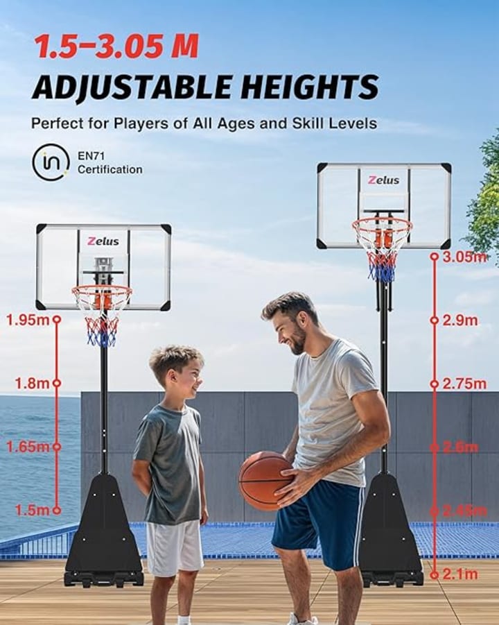 With so many options available, choosing a hoop that balances quality, durability, and convenience is key. The ZELUS Basketball Hoop Outdoor checks all the boxes. Its 3.05-meter adjustable height makes it suitable for players of all ages, while the 46 cm standard rim and 110 cm backboard deliver an authentic playing experience. The portable design, enhanced with a weight bag for added stability, makes it easy to move and set up wherever you need it—making it perfect for families, casual players, or anyone looking to bring the game home.