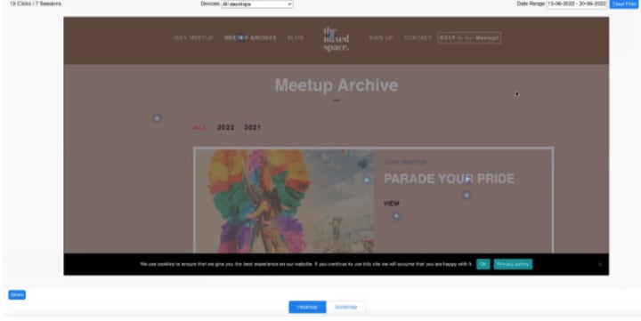 • On the top-left corner, you will see a summary of the total number of clicks and sessions that are visualized on the heatmap.