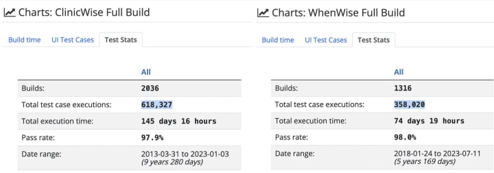 I have nearly 1 million (raw Selenium WebDriver + RSpec) test executions for my two highly dynamic web apps: ClinicWise and WhenWise, in BuildWise CT Server over the last 10 years.