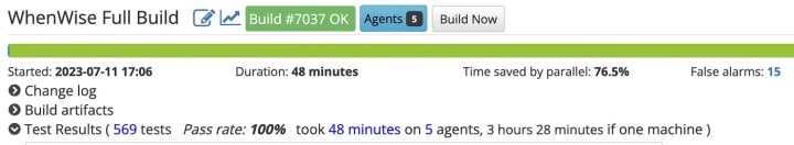 For large test suites consisting of 500+ raw Selenium WebDriver tests, as the WhenWise suite showed here, I typically use 5 buildwise agents. Very few software companies have the capability to maintain a suite of 500+ user-story level end-to-end UI tests (Level 4 of AgileWay Continuous Testing Grading) as regression testing. Usually, I recommend three build agents, which is sufficient for most.