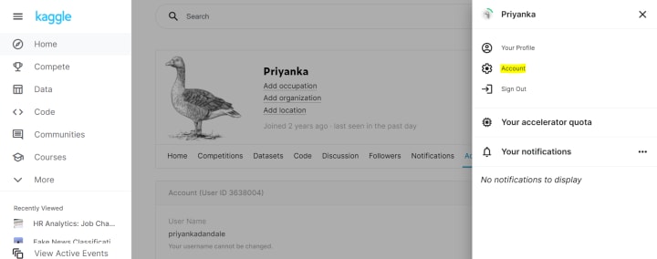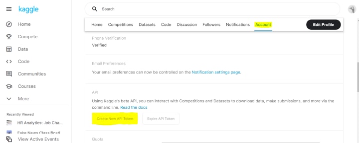 Go to your Kaggle website. If you do not have a Kaggle account then first you need to create it. Once done open your account details, scroll down to the API section click on “Create New API Token”.
