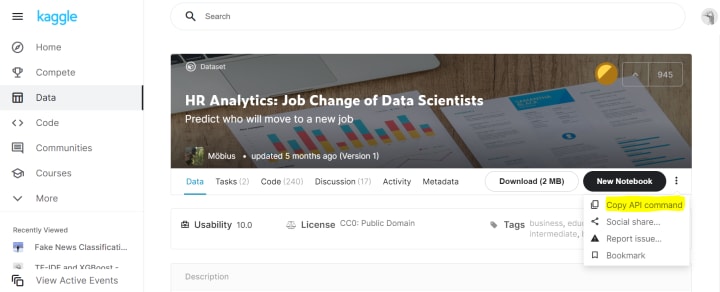 We are now ready to use Kaggle API. To use it, go to the link we needed and find “three dots” somewhere on the right side of the page. Then, select Copy API command.