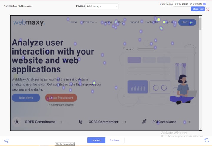 WebMaxy enables you to see the visual representations of your user behavior on your website through heatmaps. Heatmaps are a feature of Hotjar, Fullstory, and WebMaxy.
