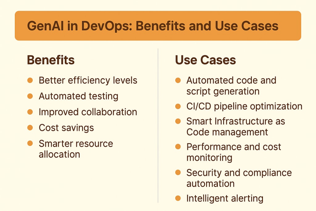 The way DevOps teams develop, test, and release software is changing due to generative AI. Gen AI enables quicker releases and more intelligent workflows by automating monotonous chores, anticipating system problems, and improving teamwork. Knowing where and how to use Gen AI becomes essential as businesses strive for speed and dependability. The options are proliferating, ranging from proactive issue management to intelligent code production. Whether you're beginning your AI integration journey or enhancing current pipelines, we highlight the most significant use cases of GenAI in DevOps in this area. Let's examine how GenAI is completely transforming DevOps.