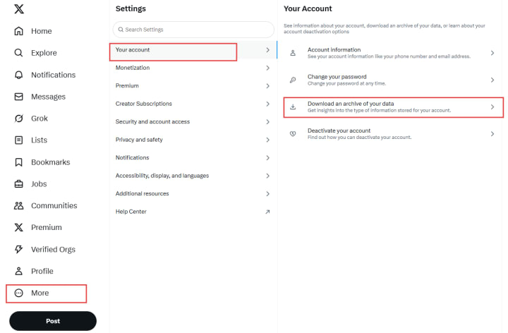 X (Twitter) does hold a significant amount of your activity history. While it doesn't offer a direct "Browse history" of every post you've seen. You can access most of this comprehensive historical data by downloading your personal data archive from your X settings.