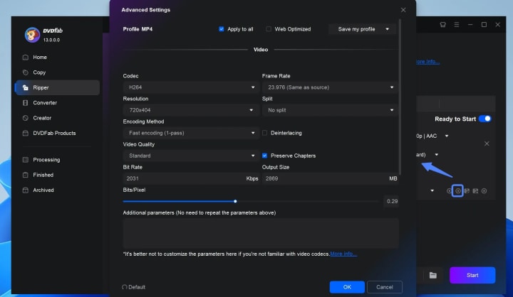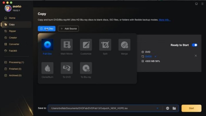 Step 6. Modify the output directory as an ISO file, folder, or drive/burner if you want to burn a blank disc. And then hit the Start button to copy the DVD on your Mac. You can set DVDFab to automatically shut down your Mac when the task is finished, so you don't need to monitor it.