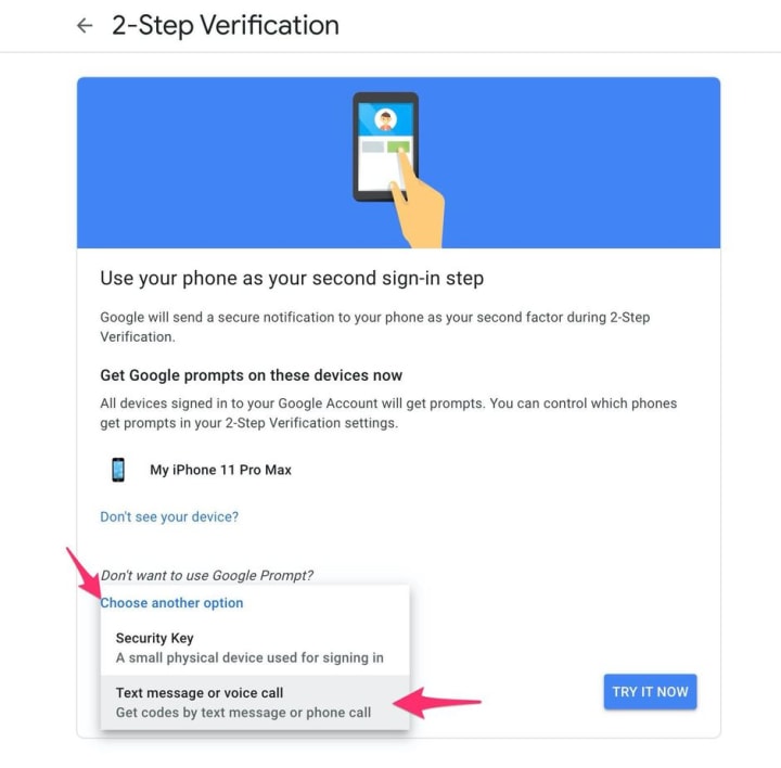 Google offers a few options for this service; an authenticator app (like Google Authenticator or Authy or Salesforce) or an SMS code. If you use an Android device, you may also be able to set up an authentication notification on your phone, too.