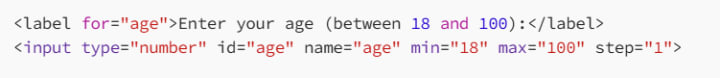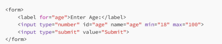 In this example, the input field only allows users to enter ages between 18 and 100. If a user tries to enter a number below 18 or above 100, the browser will display a validation error when they try to submit the form.