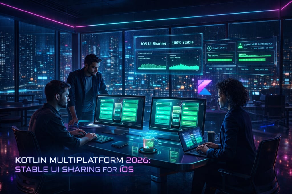 Developers explore Kotlin Multiplatform's 2026 breakthrough in stable UI sharing for iOS, bringing seamless integration and performance to modern app development against a cityscape backdrop.