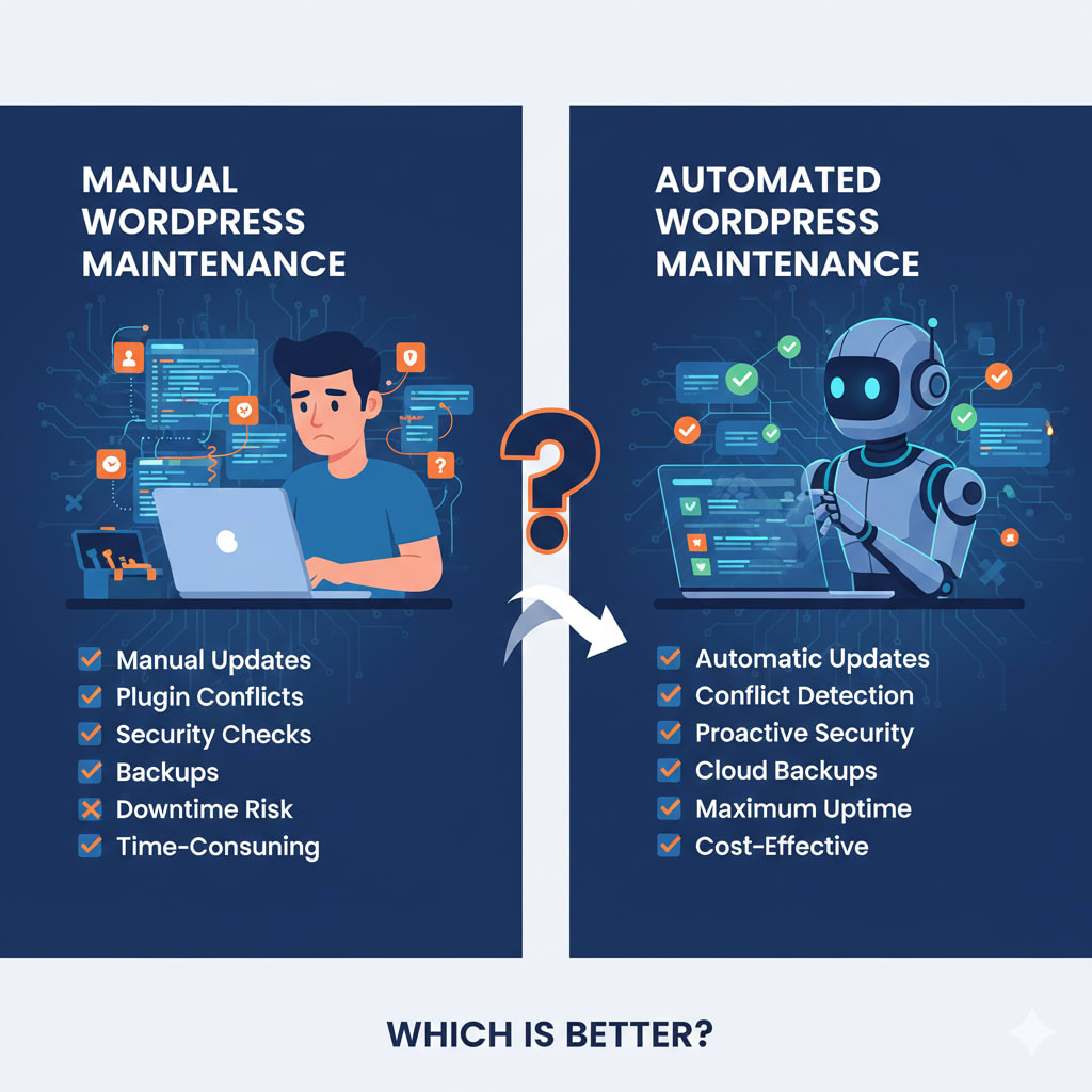 Compare manual and automated WordPress maintenance. Discover pros, cons, costs, and a checklist to keep your site secure, fast, and efficient.