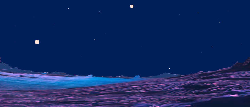 However, we have perpetual daylight, because we always face towards Procyon A, the larger star in the Procyon binary system. On average we are about the same distance from Procyon A as Uranus is from Earth’s sun, but the distance is variable, and right now we are substantially closer. Procyon A gives us much more light than a full moon on Earth, but little heat.