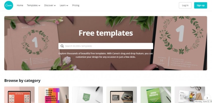 - Free design templates for various categories such as Infographics, Social Media, Presentations, and marketing materials such as flyers, brochures, etc.