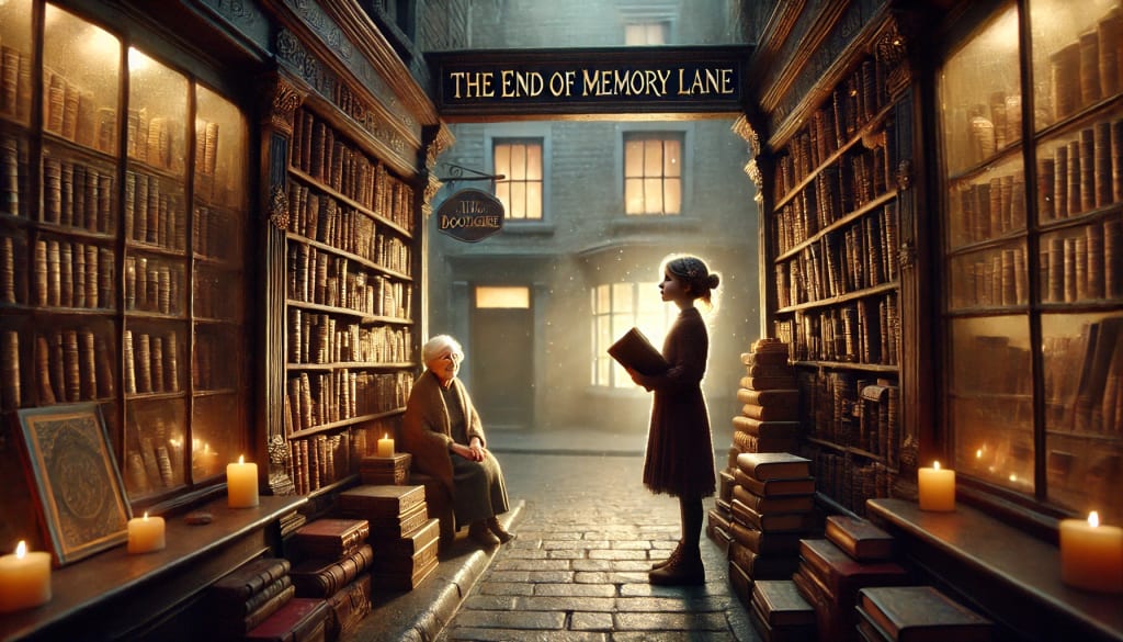 On a quiet corner, where the cobblestone street ends, sits a small, dusty bookstore with a crooked sign that reads: The End of Memory Lane. It’s the kind of place you’d miss unless you were looking for it. Cora stumbled upon it one late afternoon, caught in the rain and in search of a place to duck inside. She pushed open the heavy wooden door and was greeted by the scent of old paper and the warm glow of a single reading lamp.