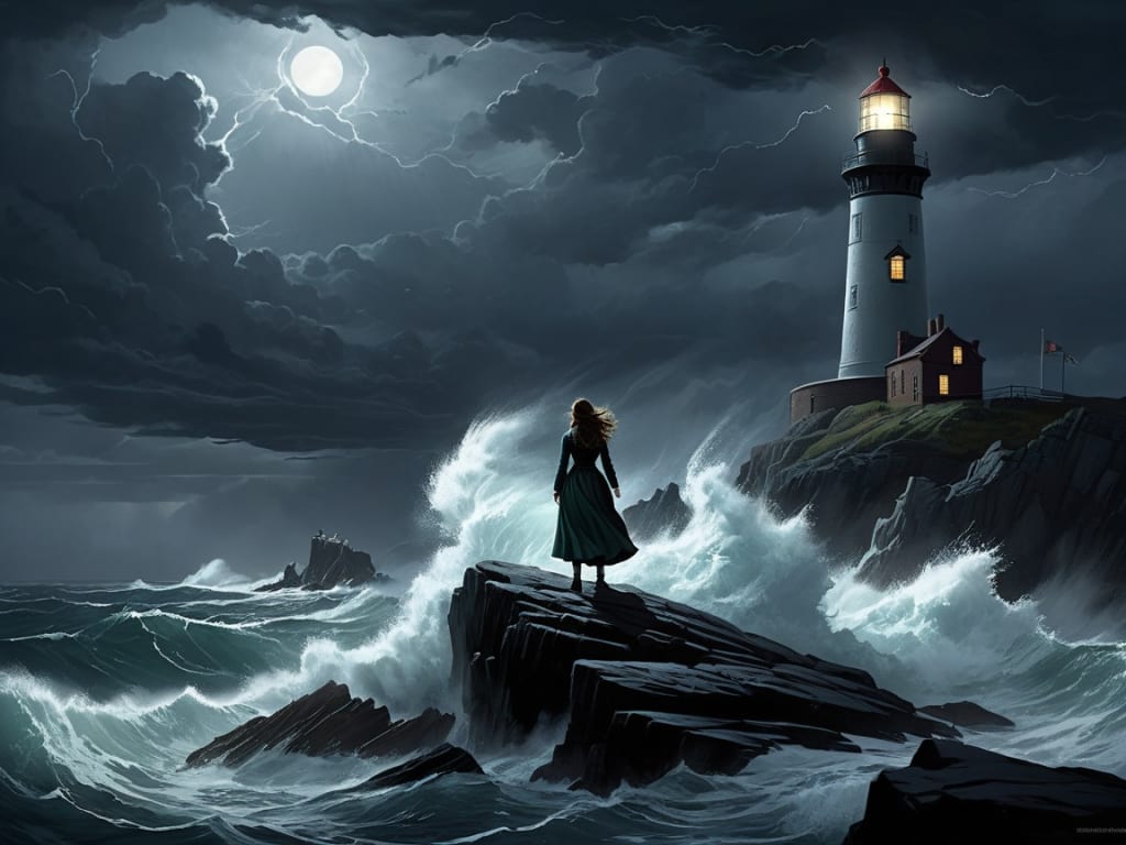 Just then, a loud knock echoed through the lighthouse. Startled, Elias opened the door to find a young woman standing there, drenched from the rain and wind. Her hair whipped around her face, and her eyes were filled with determination.
