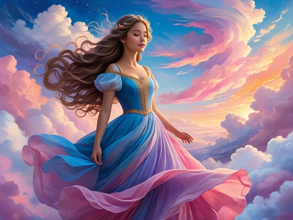 When the light faded, Elowen found herself standing on a fluffy cloud that shimmered like a pearl. Below her, the earth seemed a distant memory, and above, the sky stretched infinitely, painted in hues she had never imagined. The colors danced and swirled, a symphony of blues, pinks, and purples, all illuminated by the soft glow of the sun.