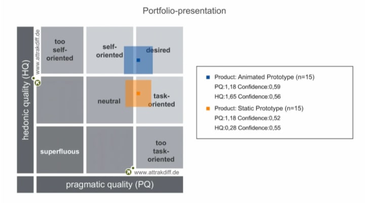 The first generated chart is called the portfolio of results and shows how the product is generally perceived (Figure 11). It is divided into nine areas and shows two big and transparent and two small rectangles. The big rectangles show the reliability of results and the smaller they are, the more accurate results are, which also means that the participants evaluated the prototypes similarly. Small rectangles indicate the average value, i.e. the average evaluation. With it being said, it is visible that the static prototype is between neutrality and the task-oriented area. The animated prototype is mostly on the desired area, partially on the self-oriented area, and tends to go down towards the task-oriented area.