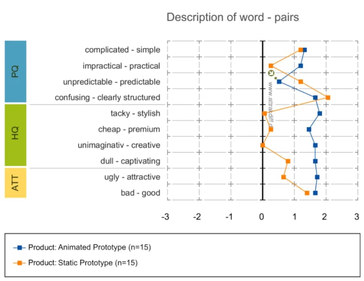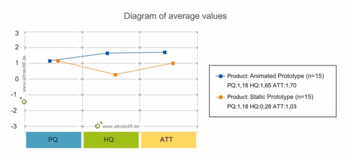 The second chart is the average values diagram showing the average results in three areas – pragmatic qualities, hedonic qualities, and attractiveness (Figure 12). When it comes to pragmatic quality, both prototypes achieved the same result and in both hedonic quality and attractiveness, the animated prototype scored better results.