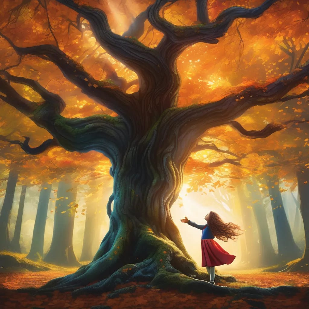 After what felt like an eternity, she stumbled upon a small clearing bathed in golden sunlight. In the center stood an ancient oak tree, its trunk gnarled and thick with age. The whispers grew louder, swirling around her like a gentle breeze. Entranced, Lily approached the tree, her fingertips brushing against its rough bark. The moment she made contact, a surge of warmth coursed through her body.