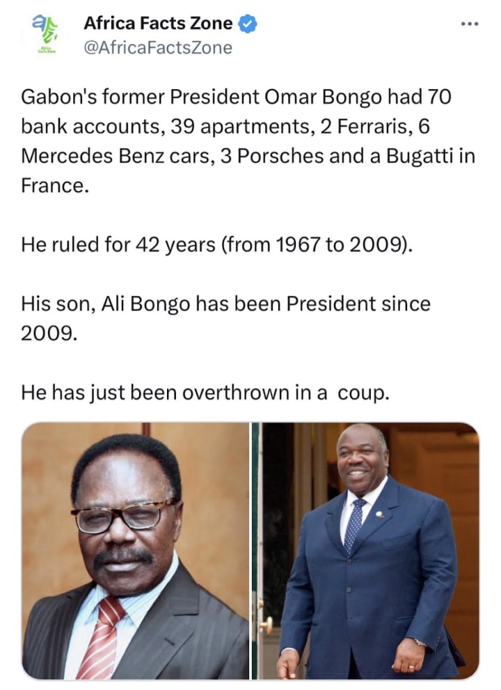 In 2009 his son Ali Bongo Ondimba, won an election. He continued in with his father's corrupted ways and 30 August 2023 he was overthrown by his military. During vote counting he refused to allow citizens to witness the counting.
