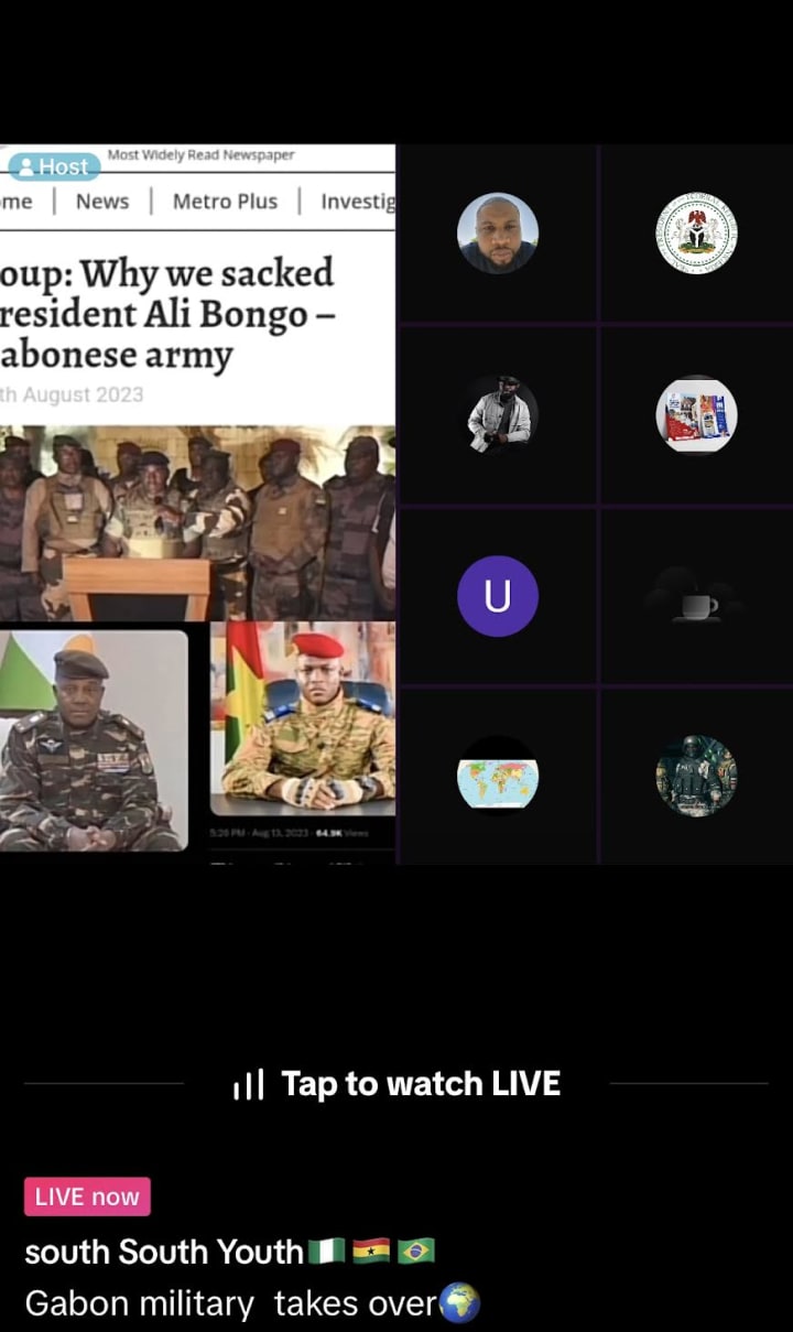 A TikTok Live is a live, streaming video, where hosts can invite others to talk about any given topics. Today, there were more than 20 of them that I was able to see throughout the day. From the time of the military take over in Gabon until late in the night in some of the African countries the users were claiming to be in.