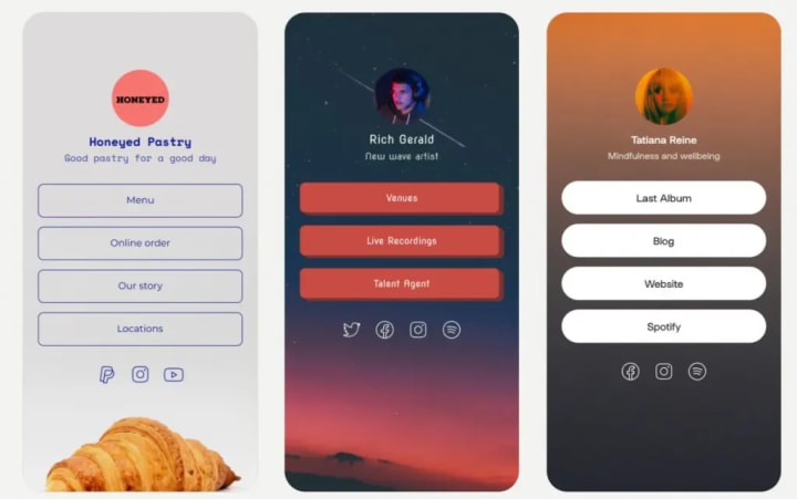 Linktree: it helps influencers and creators share their content across platforms using a single link. Linktree serves as a centralized hub or landing page where people can post multiple links to their various online platforms and profiles, such as social media accounts, websites, blogs, online stores, and more. Rather than sharing separate links for each platform, Linktree provides a single link that directs visitors to a page containing a collection of clickable icons or buttons. Moreover, the project has become popular among social media users, particularly on platforms like Instagram, where there is a limitation on the number of links that can be included in a profile bio. By including a Linktree link in their bio, users can overcome this limitation and provide a convenient way for their followers to explore their online presence.