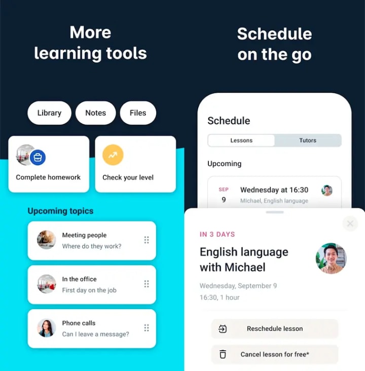 Preply: this is a one-to-one language tutoring service that operates on a marketplace model. The platform offers many language options, including popular ones like English, Spanish, French, German, Mandarin, and others. Students can browse through the profiles of tutors, read their qualifications, teaching experience, and reviews from other students. This allows them to choose a tutor that best suits their learning needs and preferences. The e-learning platform also offers scheduling and payment features, making it easy for students to book lessons at their preferred times and handle transactions securely. Additionally, Preply provides tools for tracking progress, setting goals, and evaluating the effectiveness of the classes.
