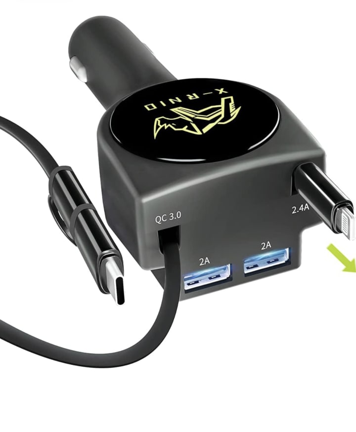 lastly the Retractable Car Charger, an essential car accessory for today's tech-savvy individuals. With its fast charge capability of 3.1A and a powerful 47W output, this charger ensures your devices never run out of battery on the go. The retractable cables, conveniently measuring 3ft in length, eliminate clutter and tangles, providing a clean and organized interior. Equipped with two USB ports, it is compatible with both iPhone and Android cell phones, accommodating multiple devices simultaneously. Stay connected and charged during road trips, daily commutes, or even emergencies. Upgrade your car's interior with this sleek and efficient car charger, a must-have for modern-day mobile lifestyles.