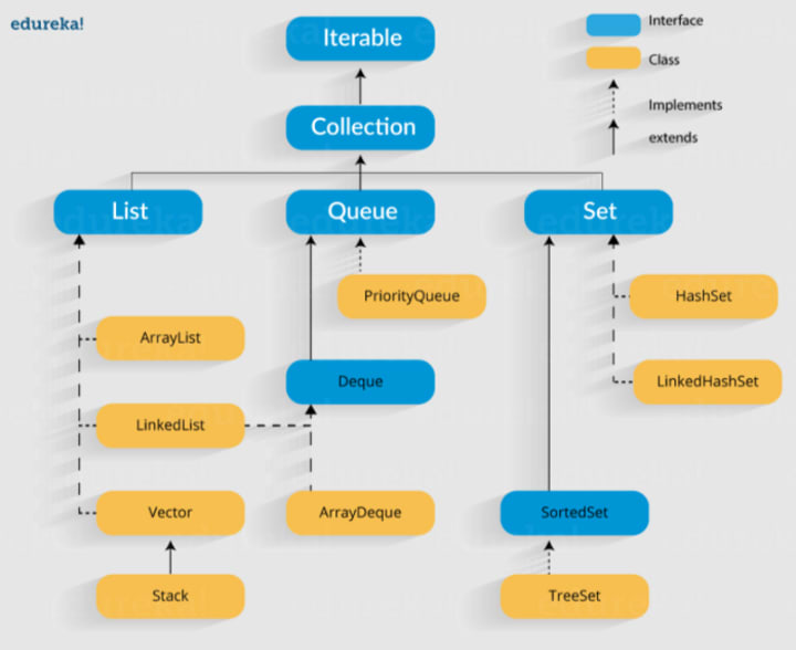 - Classes: Classes in Java are the implementation of the collection interface. It basically refers to the data structures that are used again and again.