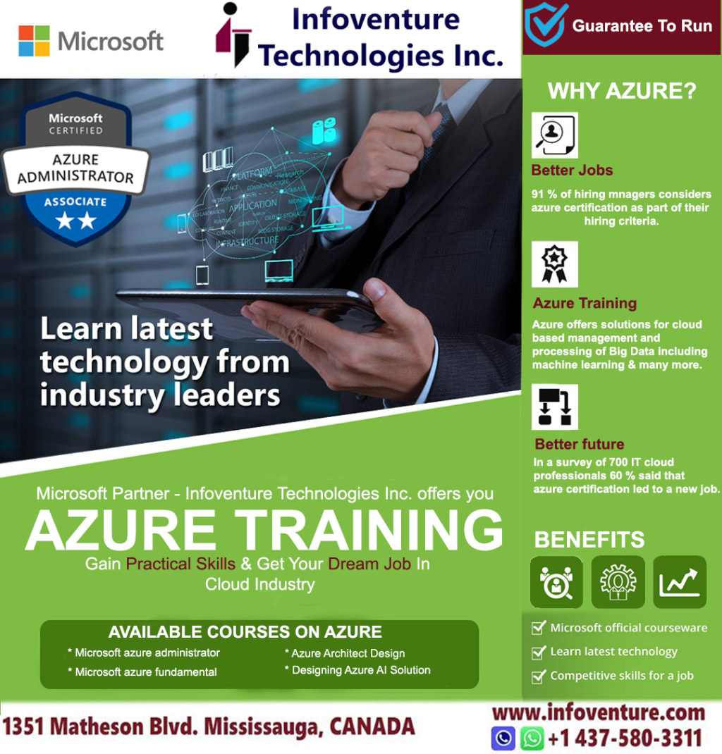 Microsoft Azure Training And Certification Courses from Infoventure Technologies with cloud lab access helps improve scalability, security, and privacy. Get Azure Certified from industry experts. Contact Now! +1 905-625-2727