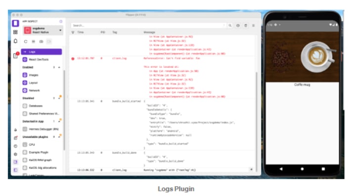 Logs: Logs (which comprise logs from JavaScript and native logs without the necessity to launch Xcode or Android Studio)