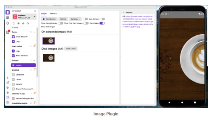 The Images Plugin is used to inspect or debug the type of images, their origin, the size of caches, delete caches, etc. As of right now, Fresco is a backend supported by this plugin. You must include the following line in your build.gradle file’s dependencies section in order to debug the image in the flipper.