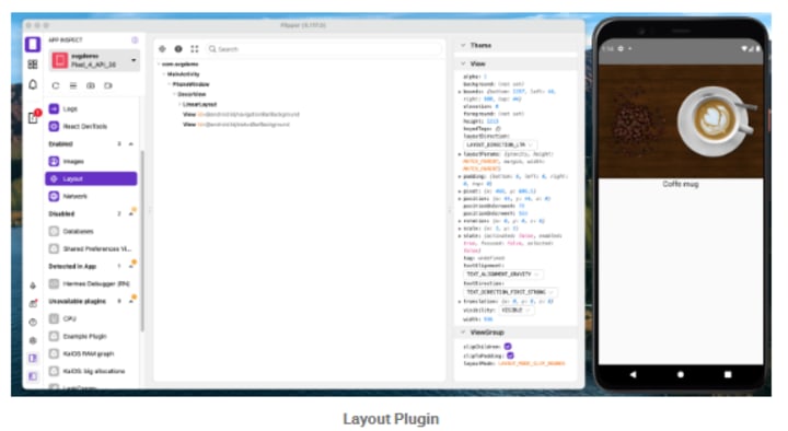 The hierarchy of all views and their characteristics are provided to us by the Layout Plugin. In order to display components in a hierarchical view, it supports Litho & component kits. Additionally, you can change layouts’ status, props, and background colors. Thanks to this plugin, you may view different styles and characteristics used throughout your application.