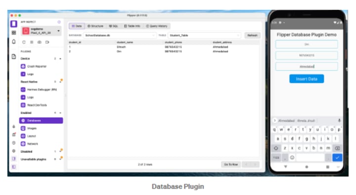 For the application’s database, the Database Plugin is used to grant read-write access. The table’s data can be browsed, queries can be run, the table’s structure can be seen, and query execution history can be viewed. Additionally, this plugin is only available for Android.
