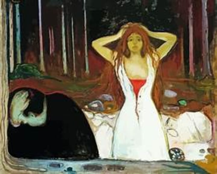 Ashes is an oil-on-canvas that depicts a young couple in a forest setting. From their expressions, the atmosphere is of despair and hopelessness. This was created during the time the artists reflected on such themes as love, anxiety, and despair. The woman is wide-eyed with disheveled hair, and the man is hunched over in dejection. This artwork is also part of his series The Frieze of Life.