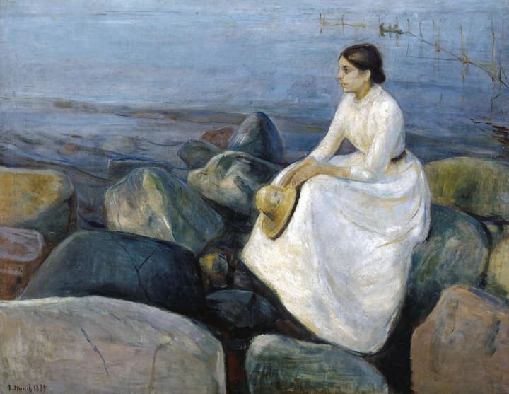Inger on the Beach is an artwork Munch created when he was in his twenties. The painting depicts his younger sister, Inger, on a summer day at the beach in a small Norwegian port town, Asgardstrand. The artist purchased a house here in 1897 and spent many summers there.