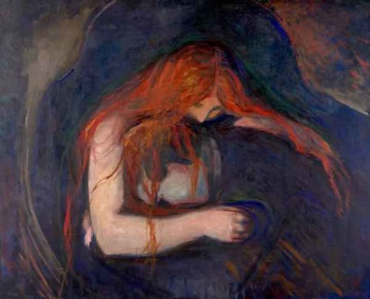 Love and Pain (Vampire) is the name of this artwork, which was given to six paintings depicting the same subjects. In the painting a woman is biting the neck of a man; therefore, there is a reference to a vampire. One version that was completed in 1894 was sold for $38.2 million at an auction in 2008.