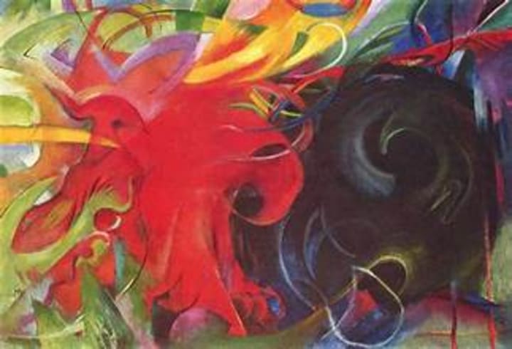 Fighting Forms is the final painting that Marc created before enlisting to fight in WWI. The artist completed this artwork as a representation of the conflict. The turmoil is depicted as a huge red parrot being dragged into a black hole. The artist was killed in the Battle of Verdun in 1916.