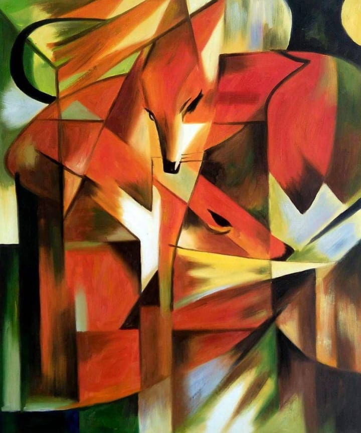The Foxes is a painting influenced by Cubist paintings. This artwork breaks down the animals into fragments and recomposes them in harmonious colors.