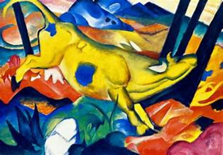 Yellow Cow is a famous painting by Marc. It depicts the barnyard animal, the cow, in bright yellow jumping about with a colorful landscape. The artist identified the color yellow with femininity and sensuality. The landscape features a dominating red which was the color for the Earth in Marc’s color symbolism.