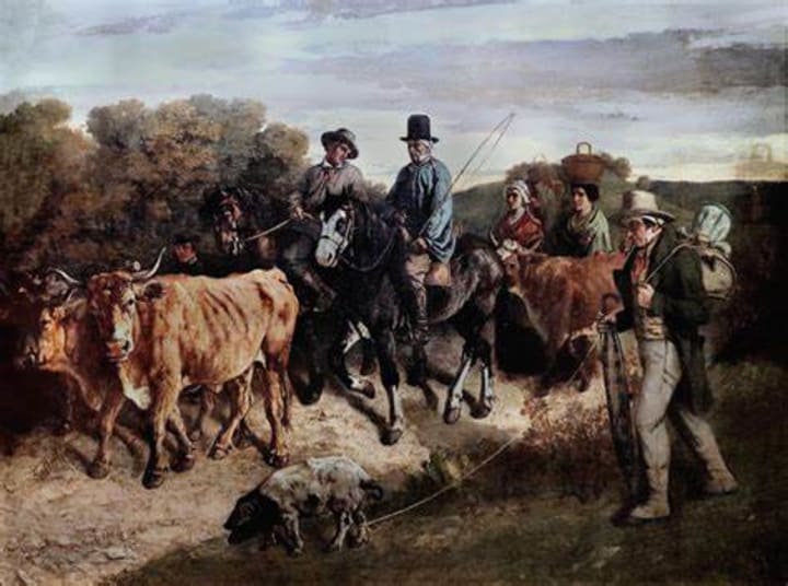 French Realism artist Gustave Courbet created this artwork in 1850. It is considered to be one of the most famous paintings featuring cattle. The painting depicts a group of farmers returning from the local fair led by two cows, There are men on horseback who travel to the fairs to buy and sell livestock,