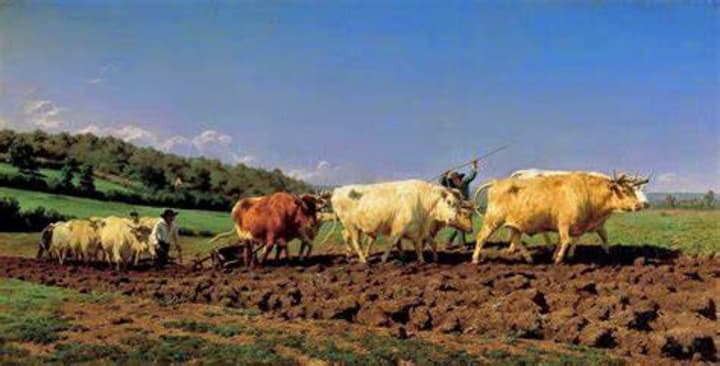 French artist Rosa Bonheur was a 19th-century painter focusing on artwork depicting animals. Her most notable works featured livestock. This painting has vivid colors and depicts the image of standing in a field watching a team of oxen drive along and till the soil. This is one of her most famous artworks featuring cattle.