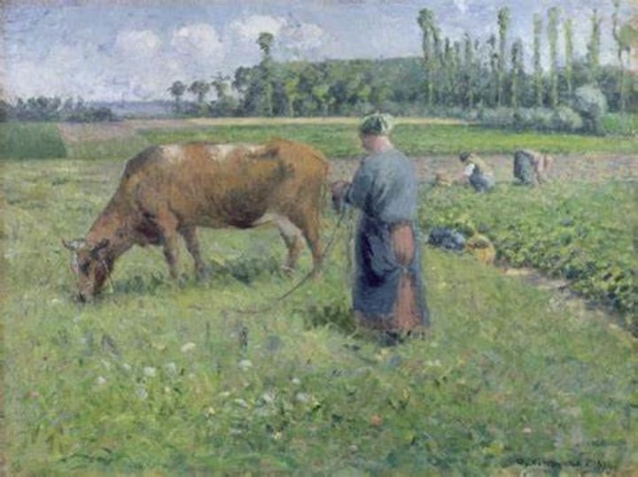 Danish-French Impressionist artist Camille Pissarro is one of the most prominent figures of the Impressionist movement. This painting depicts a sunny scene with a girl holding the reins of a haltered cow grazing along a hillside. In the background is a group of women harvesting crops.