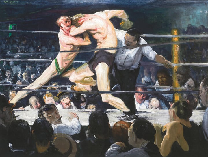 American artist George Bellows created this artwork that depicts Sharkey's Athletic Club, a rowdy bar with a backstage boxing ring. The club was established by Tom “Sailor” Sharkey, a former fighter who had previously worked in the US Navy, and it drew men who wanted to observe or engage in bouts. Since open fighting was banned in New York at the time, a private function was necessary in order for a fight to occur. Attendance was typically restricted to members of a certain organization, but when a foreigner participated, he was granted provisional admission and became characterized as a “stag.”