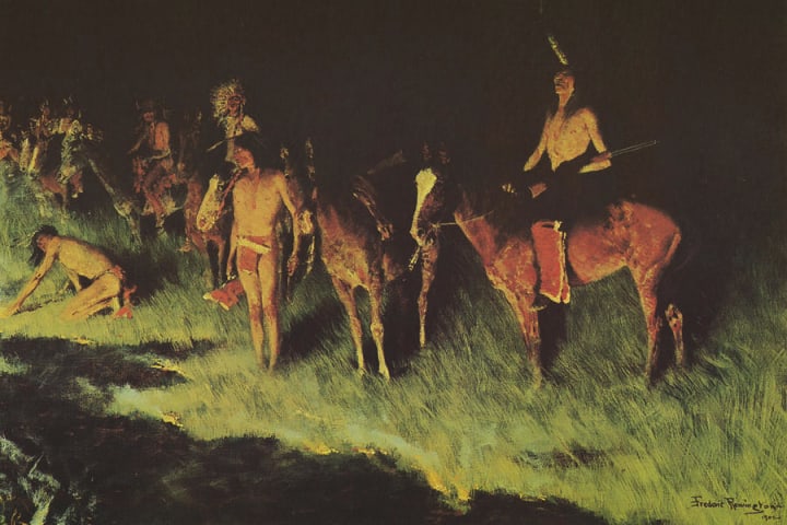 American artist Frederic Remington created this oil-on-canvas of a band of prairie Native Americans using an unconventional warfare method against unseen opponents by setting fire to grasses. Native American used this method believing that if their adversaries were downwind the smoke would obstruct their vision. The dense black field in the distance adds to that seriousness, allowing the viewer to wonder what may be lurking in that blackness, from which additional soldiers appear to arise in the distance.