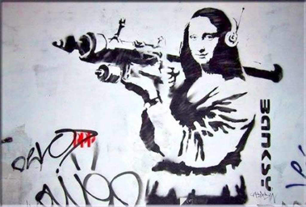 British artist Banksy is a world-renowned graffiti street artist. In the 1990s the artist started getting recognition as a graffiti artist with the DrBreadZ Crew. He turned to stencil art and used templates and graffiti for his art pieces. Among his most notable artworks are Naked, The Policemen Who Kiss, and the Mona Lisa with the Bazooka.
