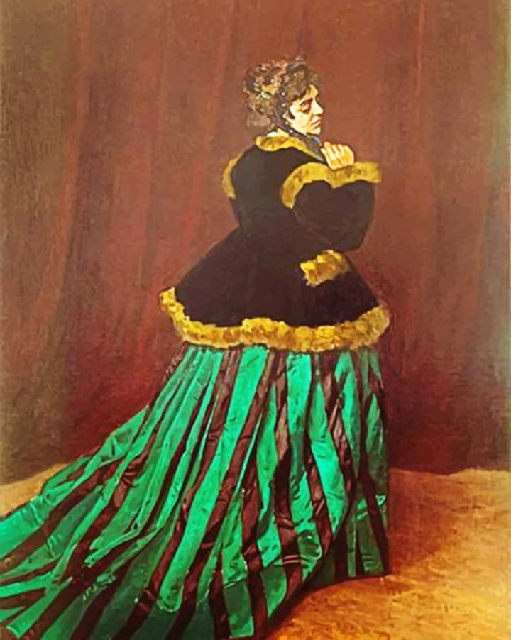French Impressionist artist Claude Monet was known for his paintings and was regarded a highly skilled realism painter. In this painting the lady in the green dress is the artitis's first wife Camille. Full-length portraits were normally reserved for royalty or aristocracy at the time, and such a picture was considered fairly unusual.