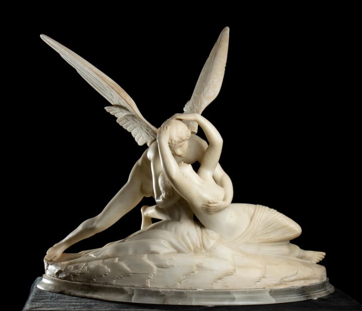 Italian Neo-Classical sculptor Antonio Canova was one of the most widely known sculptors during this period. During his career, it became popular for art galleries to illuminate sculptures by torchlight. Among his best-known artworks was this sculpture completed in 1793. The sculpture portrays Cupid, the Roman god of love and desire reviving Psyche with a kiss. The story of Psyche and Cupid is a well-known love story from Roman mythology.